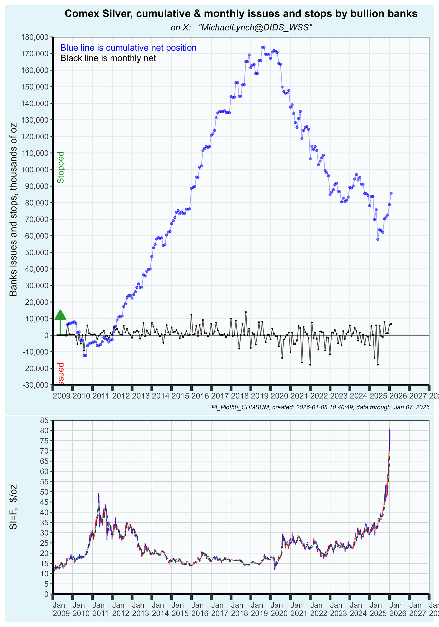 Net bank selling has been huge since the QE infinity price spike. From that point until May 2025 bullion banks sold a net 110 million oz of physical at comex. See the plot below which shows the monthly net and the cumulative net position of all bullion banks.