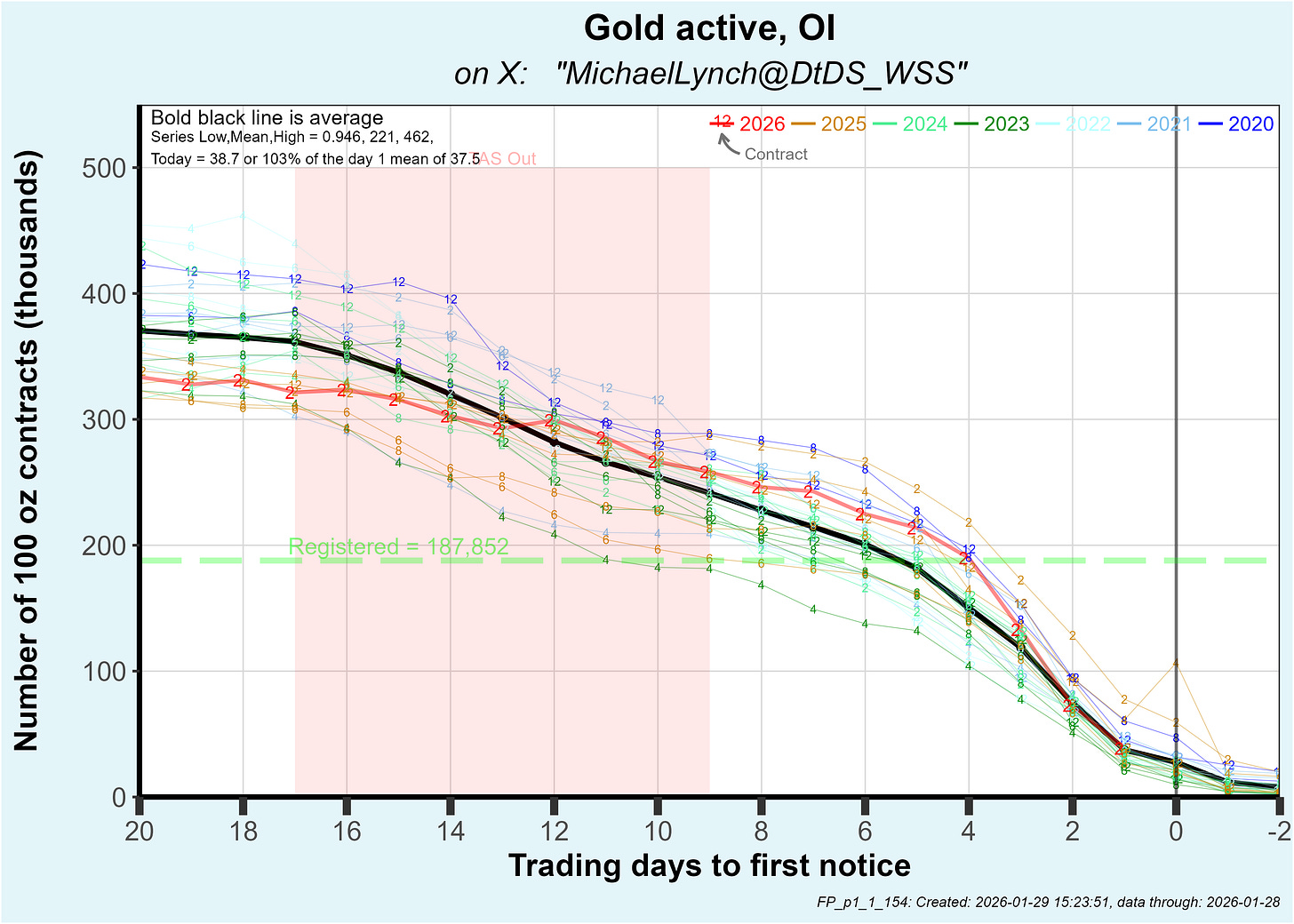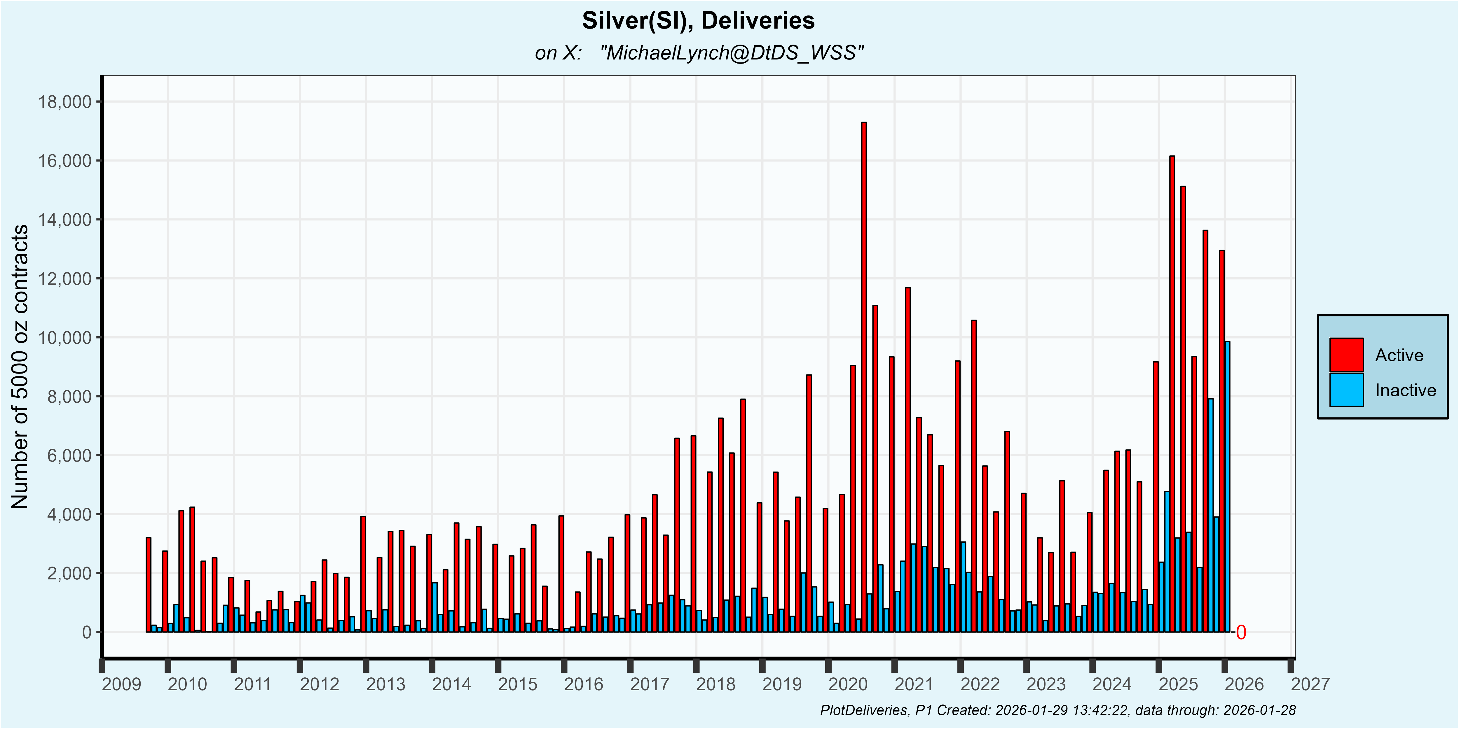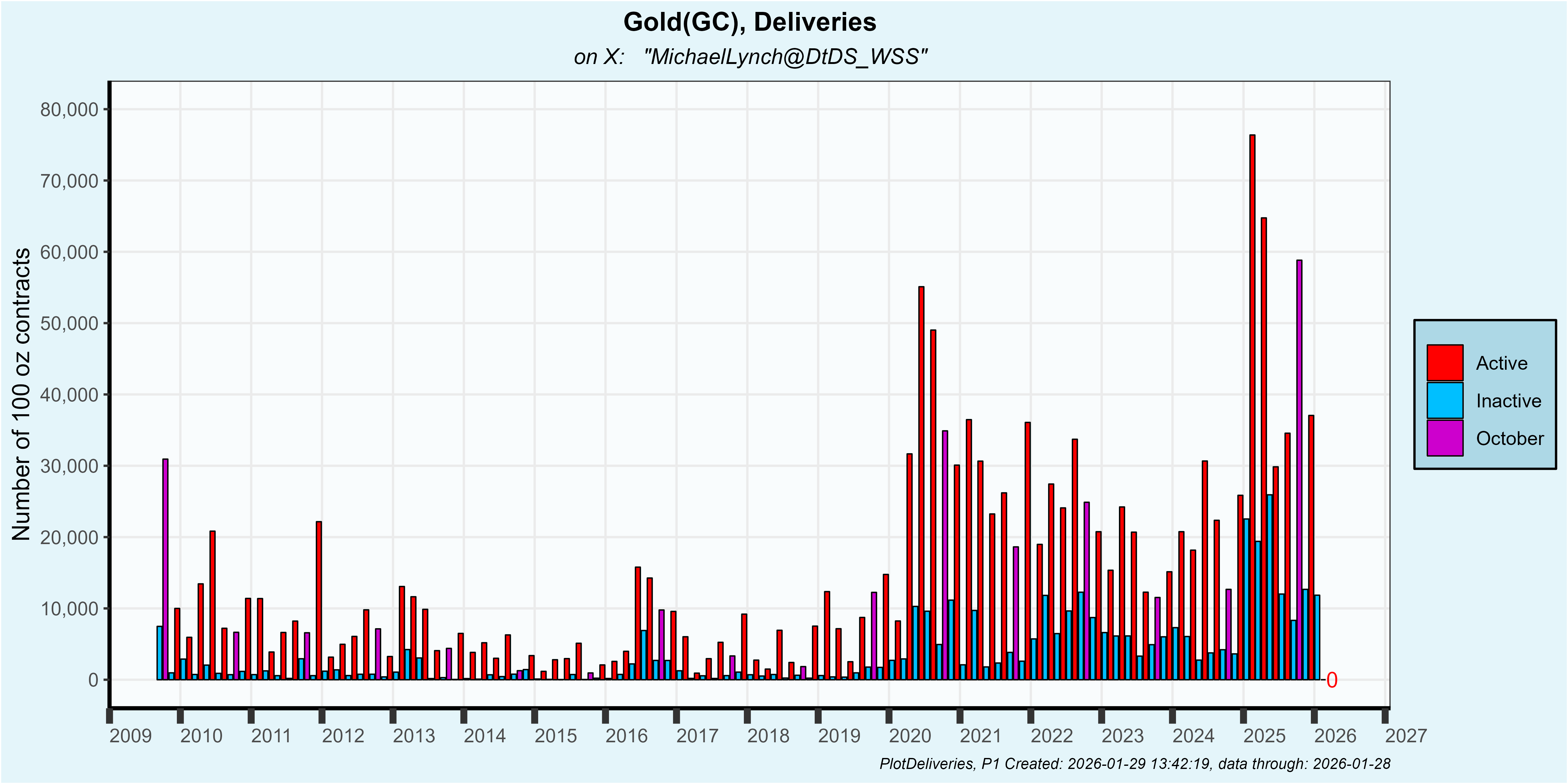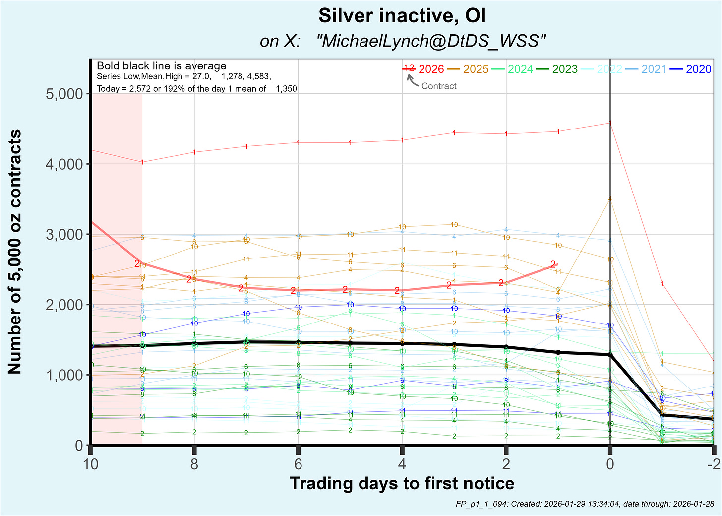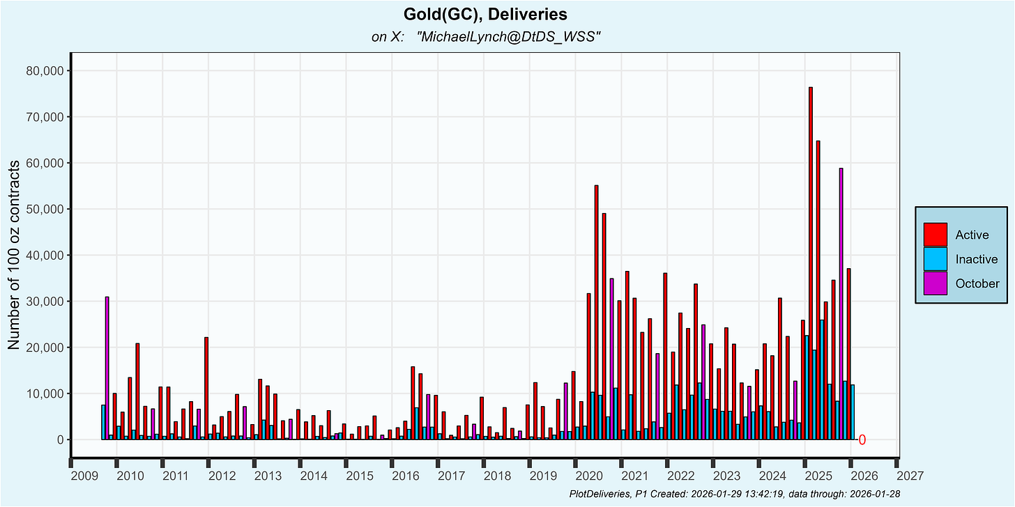 The January gold contract has had 11,862 contracts delivered so far which is about the same as the prior 3 inactive contracts. That is elevated compared to pre-25 data but off compared to early 2025 contracts:
